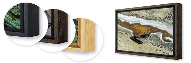 Le tirage est ensuite placé dans un cadre en bois construit sur mesure de couleur bois Naturel, Wengé ou Noir du plus bel effet de 30/20mm pour les formats 40x60cm et 60x90 cm et 50/25mm pour les formats 100x150cm et 120x180cm.